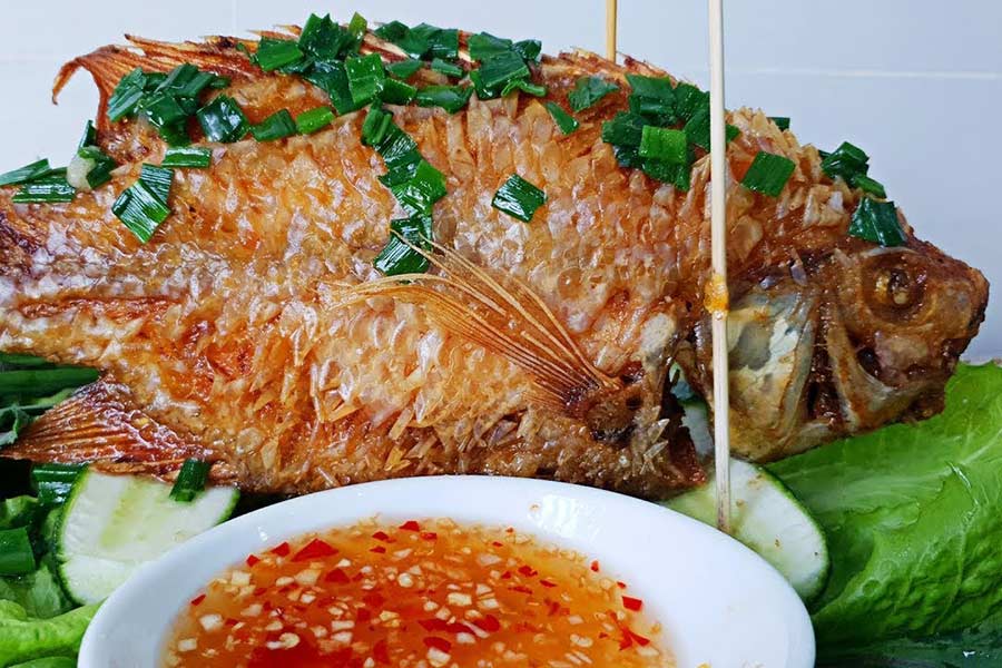 - Pha nước mắm, nước lọc, đường, thêm ớt, tỏi để chấm cá và các loại rau ăn kèm.