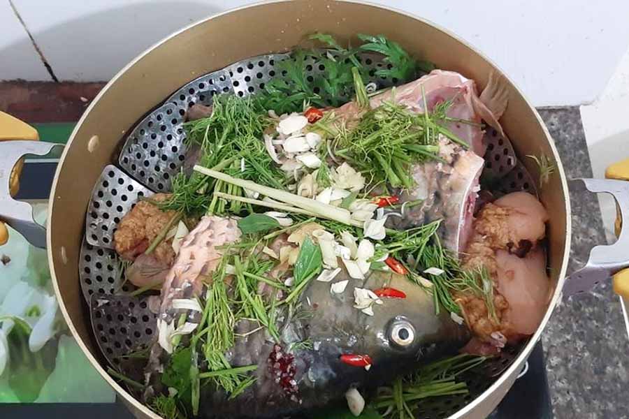 - Cho cá đã ướp vào nồi hấp, thêm vài cây sả, rau thì là, ngọn hành lá.
