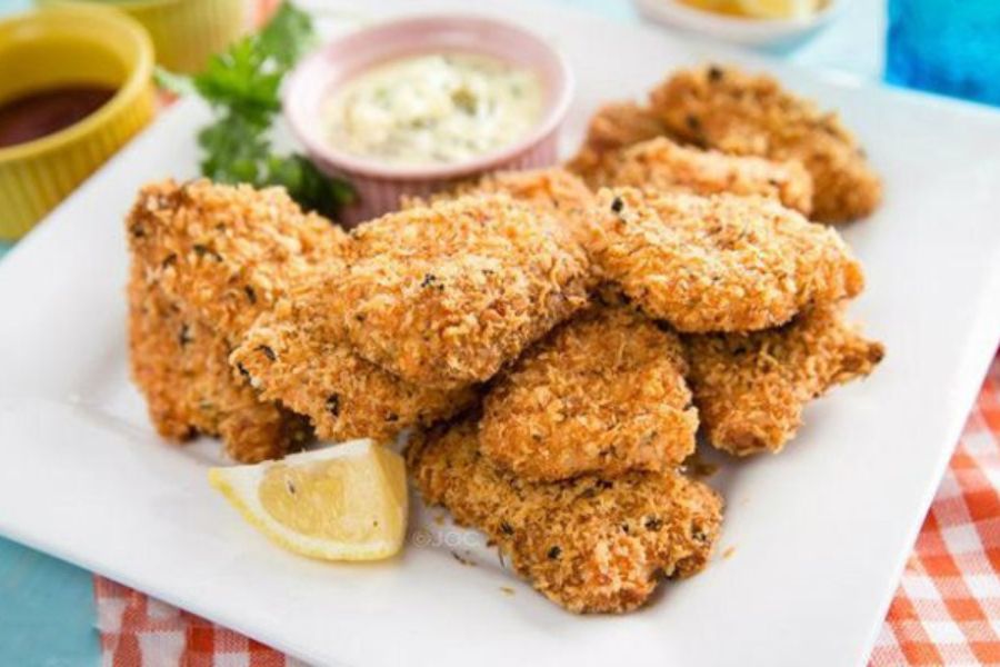 - Bước 2: Trộn bột mì, bột bắp, muối và hạt tiêu trong một bát nhỏ. Tiếp theo, đánh trứng trong một bát khác, đặt cá cờ vào và lăn qua hỗn hợp bột chiên xù.