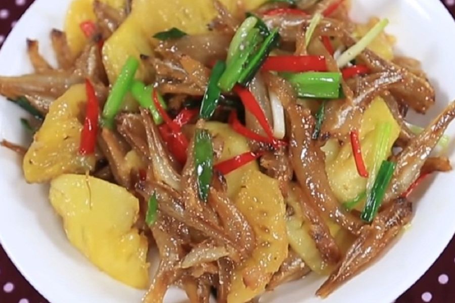 Cá cơm khô xào dứa là món ngon từ cá cơm khô không thể bỏ qua. Khi ăn, bạn sẽ cảm nhận được miếng cá cơm giòn, thấm vị mặn, cay, quyện với những lát dứa chua ngọt, dậy mùi thơm của hành lá, tỏi phi rất hấp dẫn.
