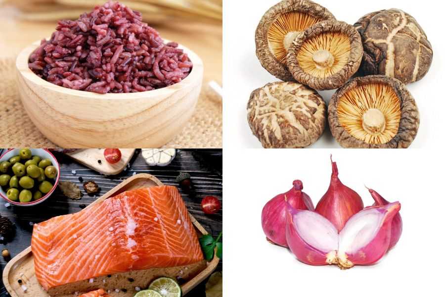 - Bước 1: Vo sạch gạo lứt, ngâm trong nước ấm khoảng 1 tiếng rồi vớt ra. Cá hồi làm sạch vảy, bỏ xương và da. Hành và nấm hương ngâm muối, rửa sạch và để ráo.