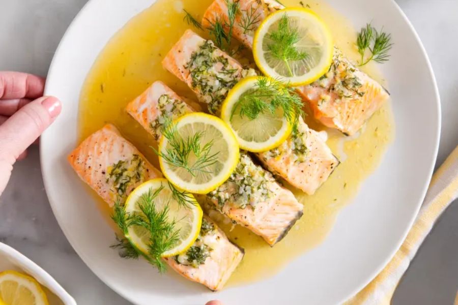 Cá hồi sốt bơ tỏi là một trong những món ăn được đề xuất cho câu hỏi “Cá hồi làm món gì ngon cho bé?”