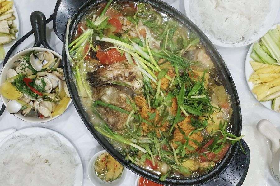 Những miếng cá tươi ngon được thả vào nồi lẩu nóng hổi cùng các loại rau sống tươi mát sẽ là món ăn ngày mưa vô cùng tuyệt vời.