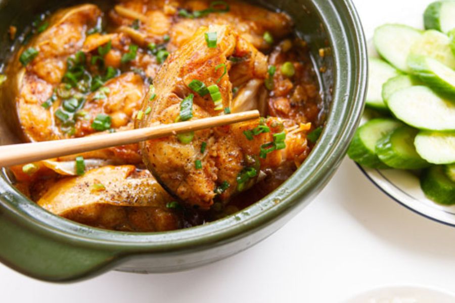 Cá trê kho tộ kho trên lửa nhỏ, cá sẽ mềm đến từng thớ thịt, nước sốt sánh mịn cùng cơm nóng hổi, thêm chút ớt cay cay khó cưỡng.