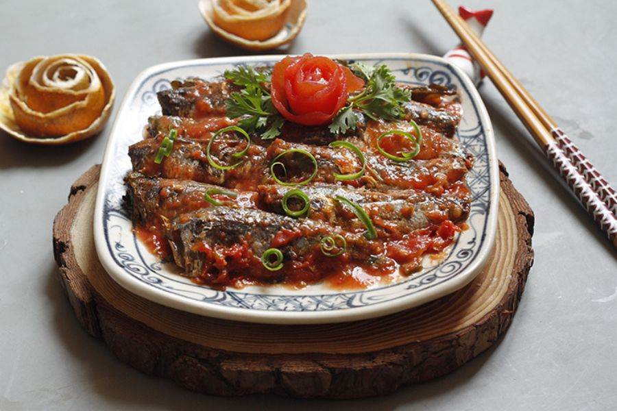 Cá trích sốt cà chua được kho đến khi mềm và thấm đẫm gia vị. Thành phẩm cho ra sẽ có màu đỏ đậm bắt mắt cùng độ sệt dẻo dai.