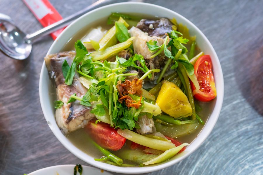 Món canh này có vị chua chua ngọt ngọt được kết hợp từ nhiều nguyên liệu như cá hú, cà chua, đậu bắp, bạc hà, giá, me,…