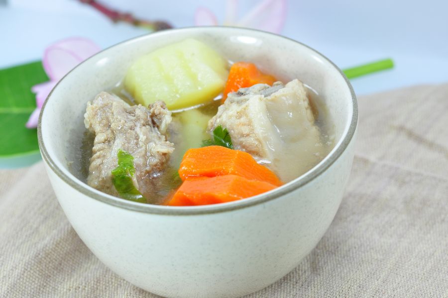 Để món ăn thêm ngon, bạn nên hầm phần sườn trong 30 phút. Sau đó bạn thêm các loại củ vào nấu cho đến khi nước sôi thì hạ lửa, nêm gia vị vừa khẩu vị gia đình bạn.