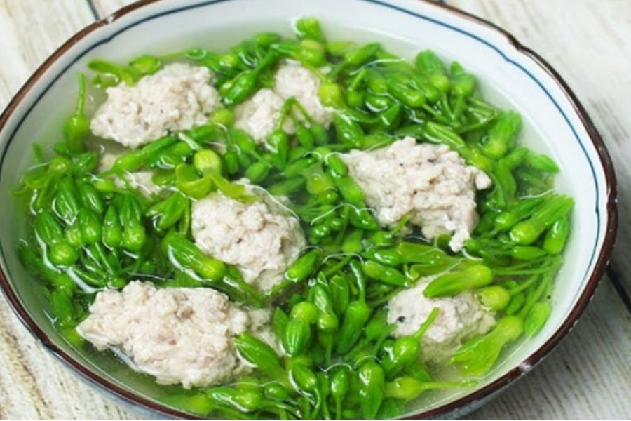 Canh hoa thiên lý nấu thịt viên có vị ngọt tự nhiên của hoa thiên lý, vị giòn của thịt viên, hương vị thơm ngon của hành tỏi và gia vị vừa miệng.