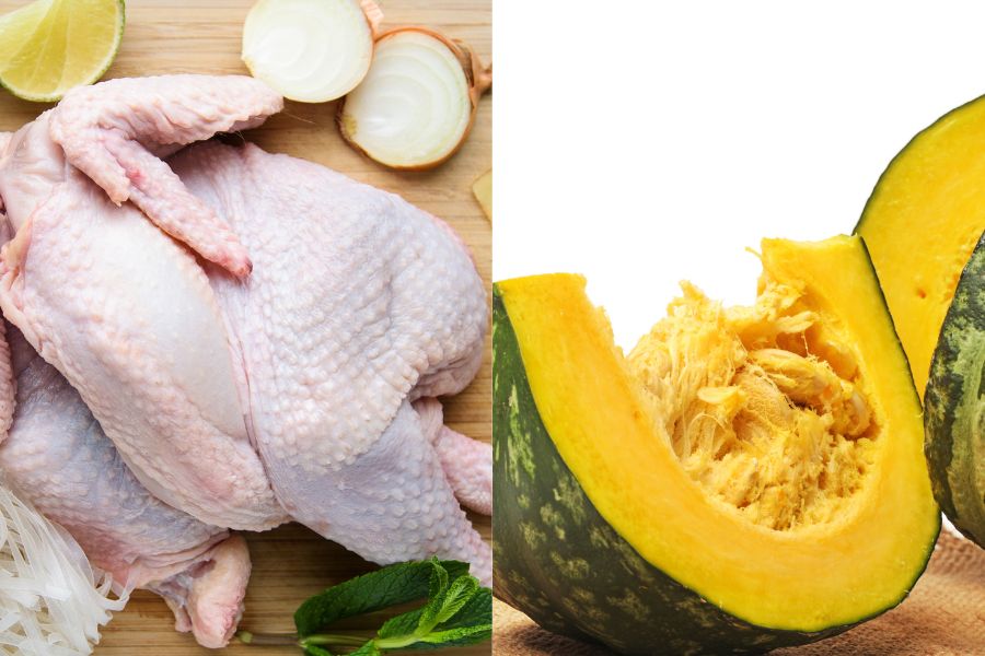 Trước khi bắt đầu nấu món canh này, thịt gà phải được rửa sạch, thái miếng vừa ăn và ướp với gia vị trong vòng 15 phút. Trong khi chờ gà thấm gia vị, bạn cho bí đỏ vào xào sơ với hành và tỏi băm nhỏ, sau đó múc ra để riêng.