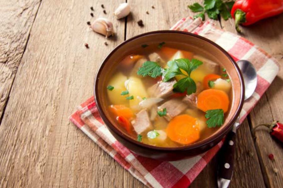 Canh thịt nạc hầm rau củ là một món ăn giàu dinh dưỡng và có công dụng giải nhiệt hiệu quả vào những ngày nắng nóng. Món canh này là sự kết hợp giữa nhiều loại rau củ như: Cà rốt, khoai tây,… hòa quyện cùng vị thơm béo của thịt heo hầm khi ăn cùng cơm nóng là hết sảy.