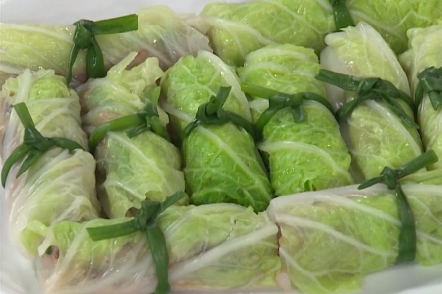 - Bước 4: Buộc hành vào từng miếng để vừa có tác dụng trang trí, vừa có tác dụng giữ cho miếng cải thảo (bắp cải) chắc. Lần lượt cuốn cho tới hết