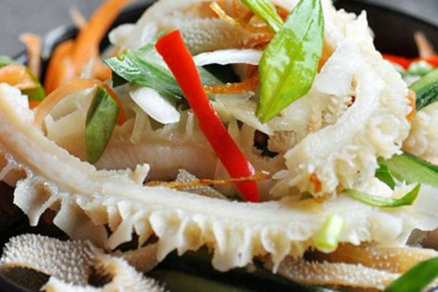 - Bước 1: Dùng muối và giấm để khử sạch mùi hôi và nhớt bám trên lá sách bò. Luộc lá sách với nước, thêm muối và ít gừng khoảng 15 phút. Vớt lá sách ra bỏ vào nước đá để lá sách được giòn hơn.