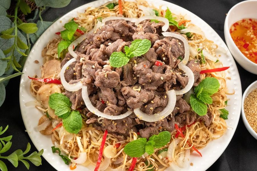 - Bước 5: Cho rau má, cà rốt và hành tây vào cùng 2/3 nước sốt trộn đều rồi để khoảng 10 phút cho ngấm. Sau đó, bạn cho thịt bò vào và đổ từ từ phần nước mắm còn lại rồi nêm nếm cho vừa vị. Tiếp theo, bạn mang ra đĩa rồi rắc hành, tỏi phi vào là hoàn tất.