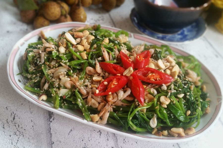 - Bước 5: Bạn hãy chuẩn bị 1 tô lớn sau đó cho lần lượt nguyên liệu gồm rau muống, tôm khô vừa xào, rau thơm và nước trộn đã pha. Kế đến, bạn trộn cho đến khi các nguyên liệu hòa đều vào nhau là hoàn thành. Cuối cùng, bạn rắc thêm một ít đậu phộng đã rang sẵn để món ăn thêm thơm ngon.
