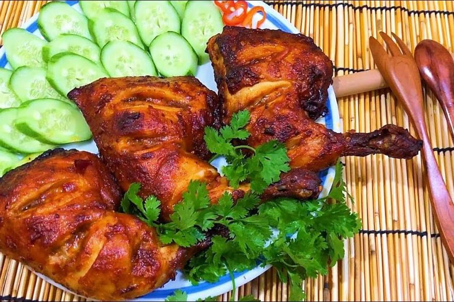 Bạn quấn kín thịt gà bằng giấy bạc rồi đặt gà trong nồi nướng ở nhiệt độ tầm 200 độ C khoảng 45 phút. Bạn chỉ việc lấy thịt gà ra và quét thêm một lớp sốt rồi nướng tiếp thịt gà lần hai khoảng 30 phút ở nhiệt độ 250 độ C. Cuối cùng, bạn lấy thịt gà, cắt từng miếng vừa ăn và có thể dùng phần nước gà tiết ra trong lúc nướng để làm nước chấm.