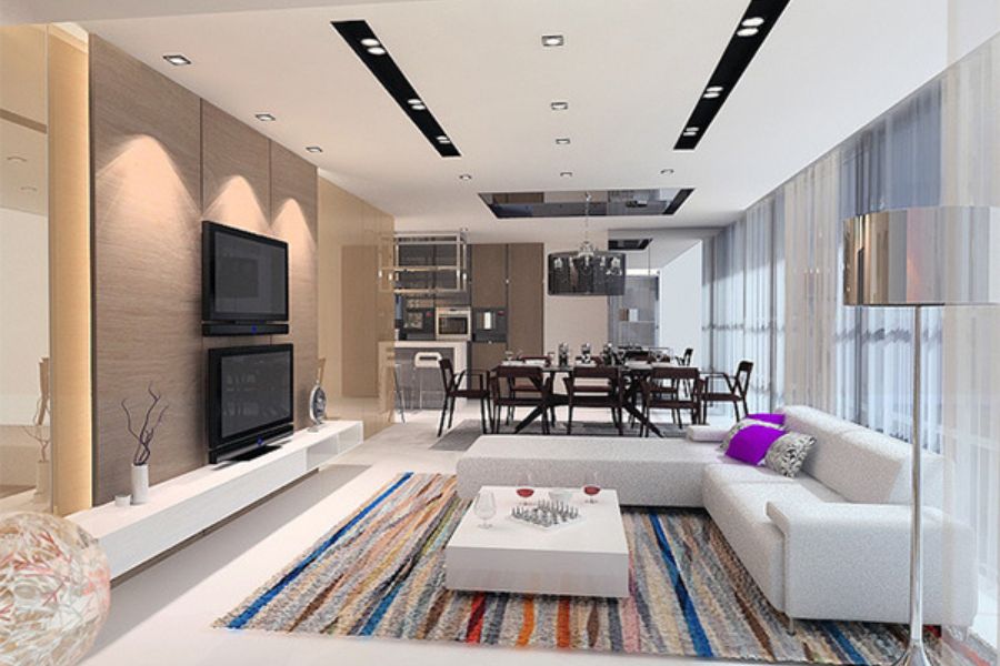 Nên sử dụng trần nhà thạch cao để nâng cao tính thẩm mỹ hoặc sử dụng cửa kính tại phòng khách để không gian thêm thoáng đãng và tràn ngập ánh sáng.