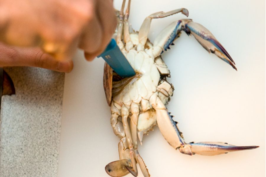 - Bước 1: Bạn hãy dùng một chiếc kéo hoặc dao nhỏ có đầu nhọn lật phần yếm ghẹ ra và chọc vào phần chóp yếm. Bạn thực hiện như vậy cho đến khi thấy càng và chân của ghẹ duỗi ra hết và không còn cử động nữa là được.