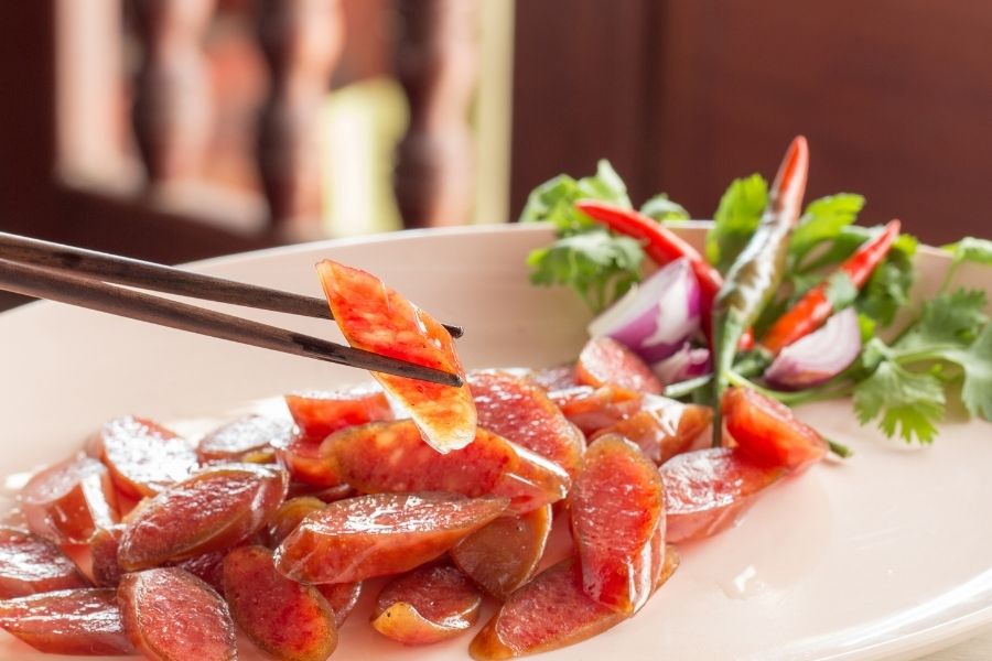 Các món ăn từ lạp xưởng tươi: Lạp xưởng chiên hoặc áp chảo, lạp xưởng nướng, lạp xưởng hấp nước dừa,…