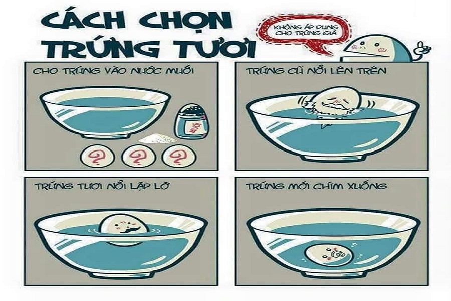- Ngoài ra bạn có thể phân biệt trứng bằng cách cho và thau nước lạnh. Trứng mới đẻ sẽ chìm xuống đáy và nằm im. Còn những quả trứng có một phần nổi trên mặt nước là đã để gần 1 tuần.