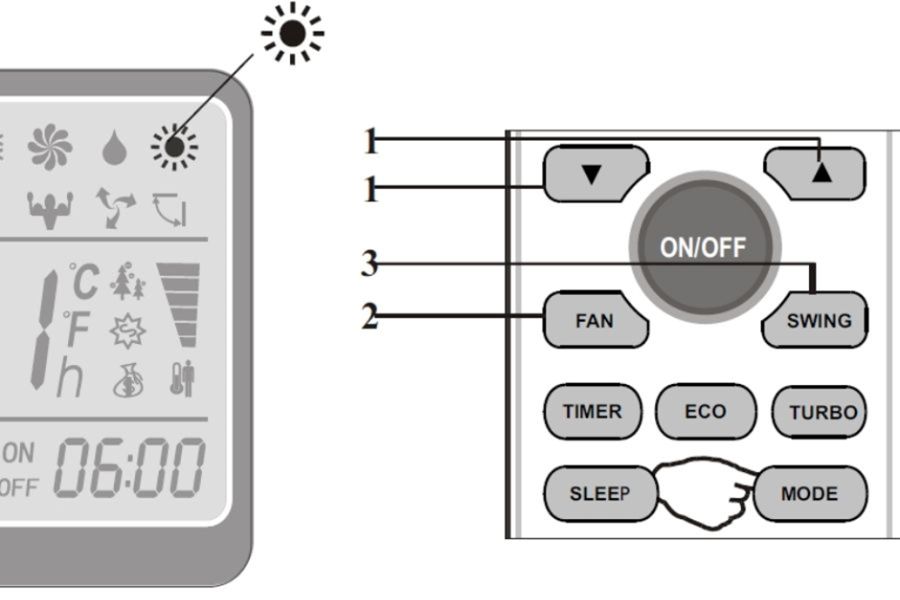 | Cài đặt các chế độ | Nhấn nút MODE trên điều khiển và lựa chọn chế độ mong muốn. Các chế độ bao gồm: – AUTO (Tự động): Máy lạnh tự động chọn chế độ làm lạnh dựa trên nhiệt độ được cài đặt. – Cool (Làm mát): Chế độ làm mát thông thường. – DRY (Hút ẩm): Chế độ làm khô, giúp giảm độ ẩm trong không khí. – HEAT: Chế độ sưởi ấm. – FAN (Quạt): Chế độ chỉ hoạt động như một quạt thông thường và không làm lạnh. |