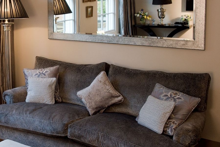Việc đặt gương phía sau ghế sofa để tạo cảm giác phòng khách có diện tích rộng hơn, thông thoáng hơn là một quan điểm vô cùng sai lầm trong phong thủy.