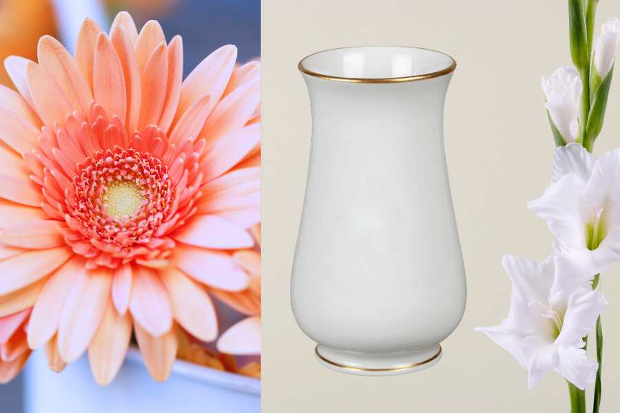 - Bước 1: Chuẩn bị một chiếc bình có độ cao phù hợp, chuẩn bị thêm 3 bông hoa đồng tiền và 6 bông hoa lay ơn. Ngoài ra, chuẩn bị thêm một ít lá cau nhỏ nhé.
