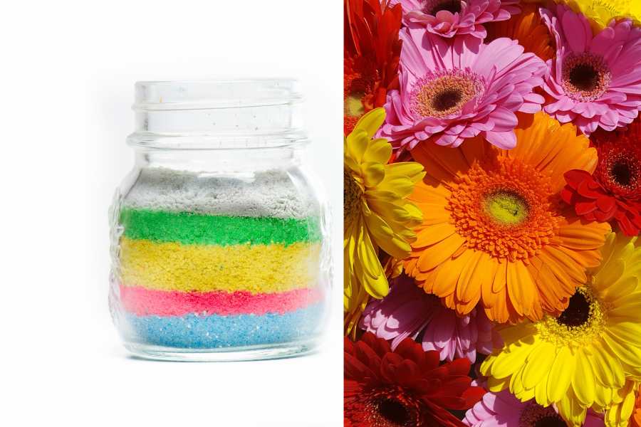 - Bước 1: Ngoài chuẩn bị những cành hoa đồng tiền màu sắc, bạn hãy chuẩn bị thêm một hũ cát với màu sắc tuỳ ý nhé.