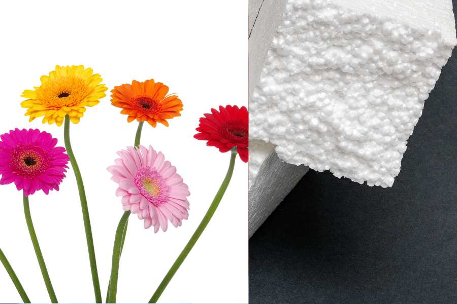 - Bước 1: Chuẩn bị một số bông hoa đồng tiền đầy đủ màu sắc, một miếng xốp và một ít lá mộc lan.