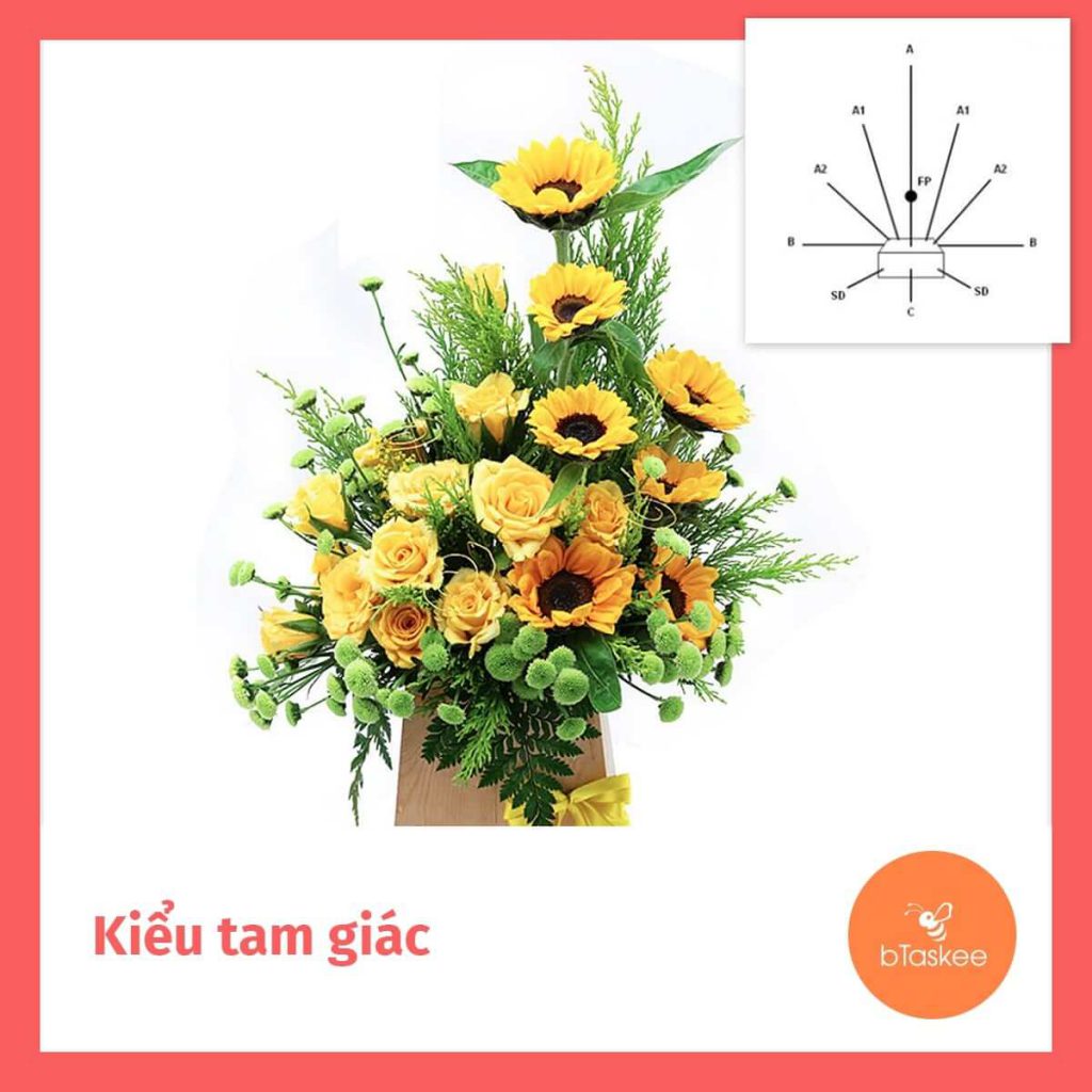 Khi cắm hoa theo hình tam giác cần chú ý vị trí của những bông hoa dùng để hình thành hình dáng này, cần sắp xếp chiều cao nhiều hơn chiều rộng.