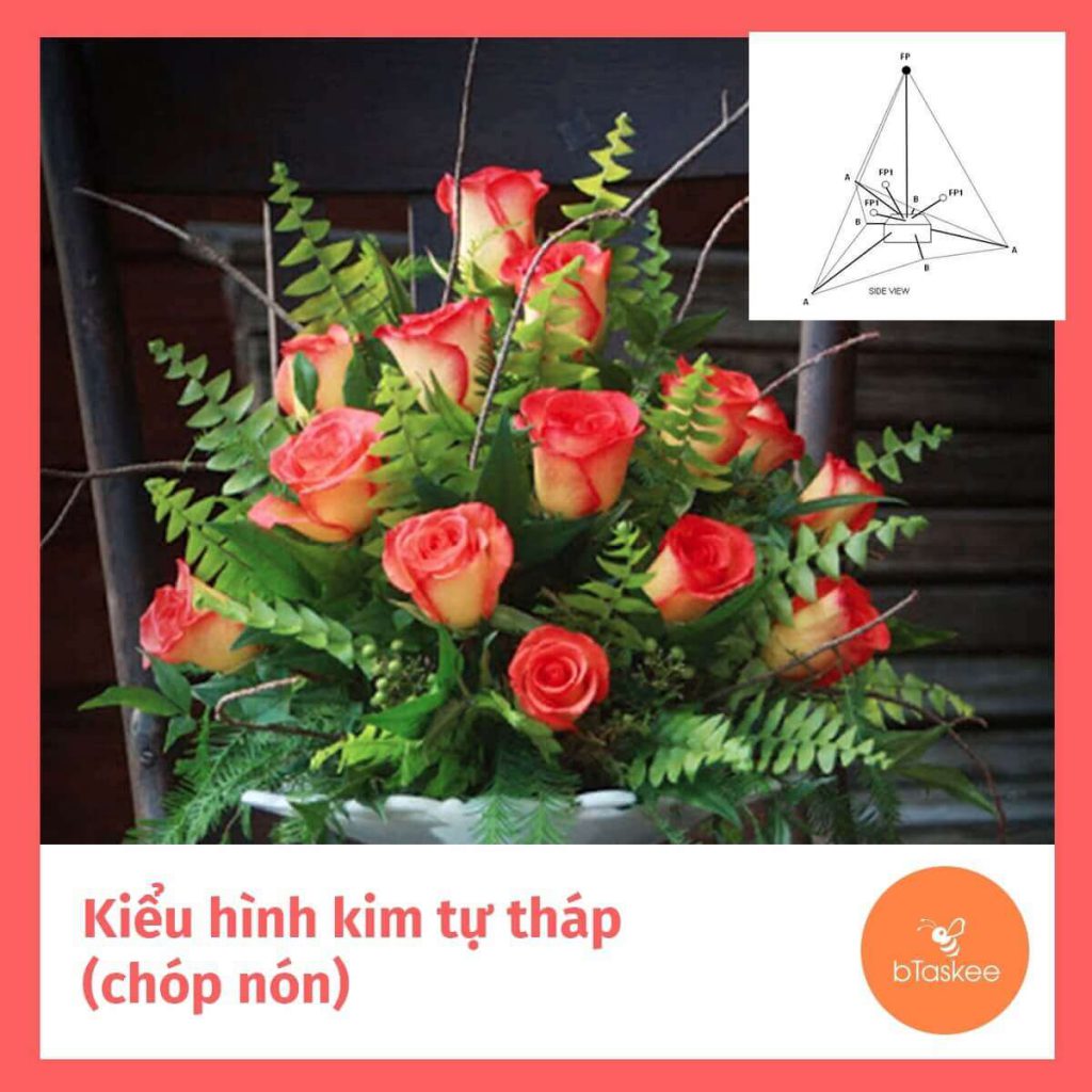 Đây là cách cắm hoa cơ bản và phổ biến nhất trong các kiểu cắm hoa để bàn. Khi cắm hoa theo hình chóp nón, các bông hoa sẽ được sắp xếp theo hướng nhọn và rất cao, chúng sẽ được cắm theo độ cao từ cao xuống thấp dần.