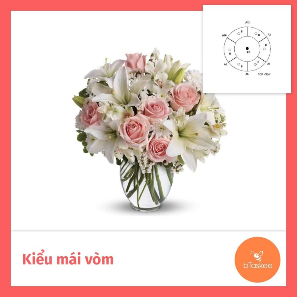 Nếu xét theo góc nhìn từ trên xuống, đây sẽ là cách cắm hoa kiểu tròn, nhìn trông khá đẹp mắt. Với kiểu cắm hoa này, phần lớn hoa được xếp theo hình tròn và chiều cao các bông hoa ở mức trung bình. Cắm hoa mái vòm có khá nhiều phong cách khác nhau và là cách cắm hoa được nhiều người yêu thích.