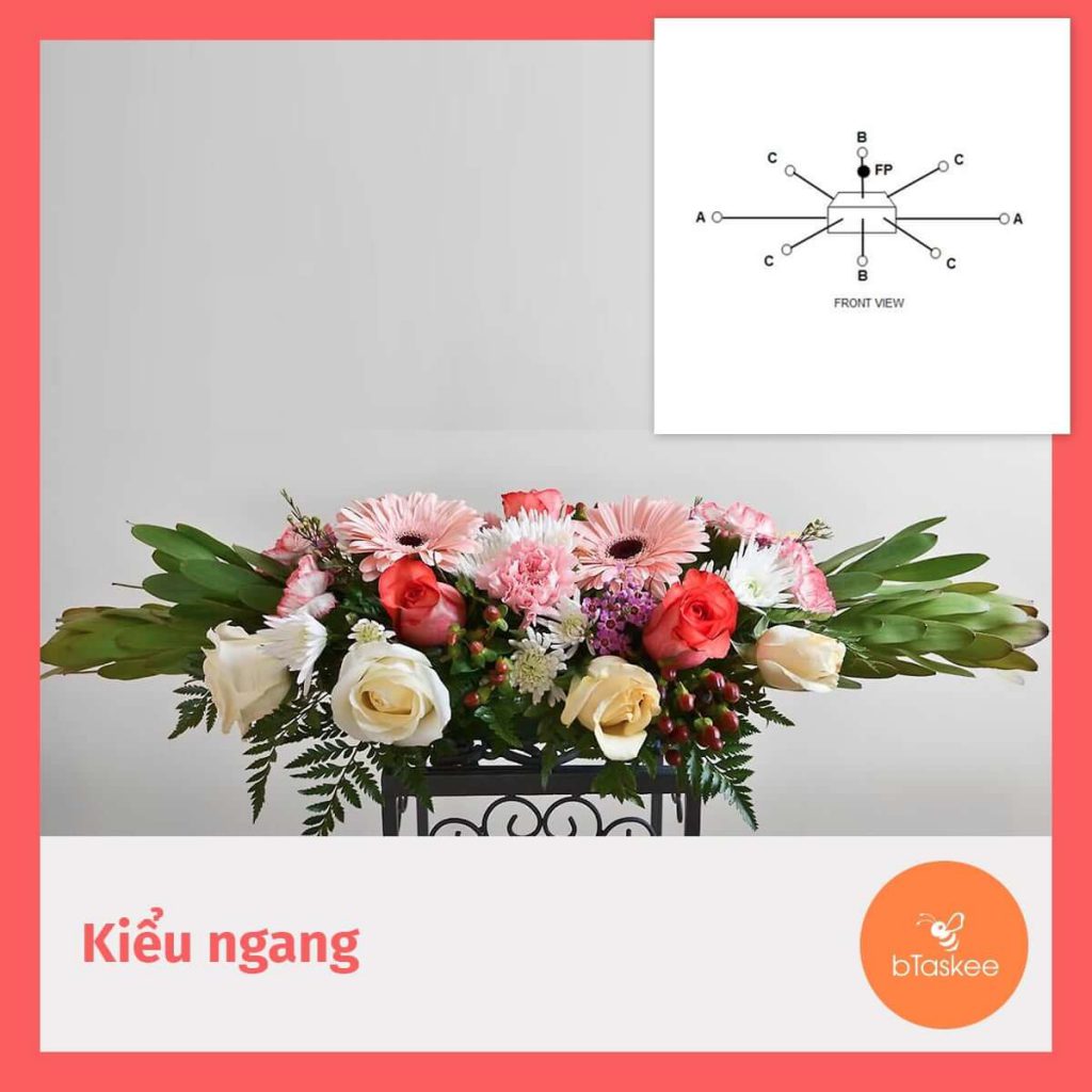 Khi cắm hoa ngang, các bông hoa sẽ được sắp xếp theo chiều ngang cổ điển và đối xứng, chiều dài 2 bên là như nhau, thường gấp 2 lần chiều cao. Người cắm thường áp dụng cách cắm hoa này ở bàn tiệc, đám cưới, hoặc bàn ăn trong gia đình.