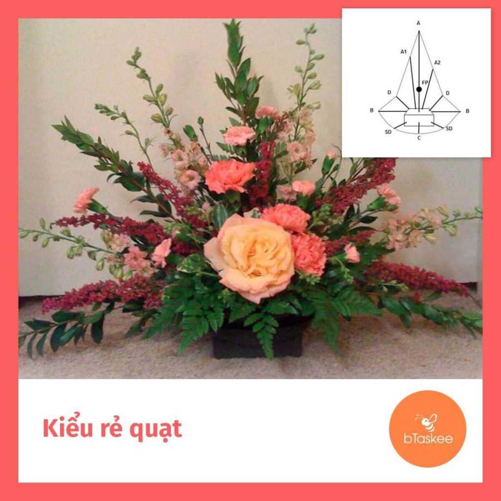 Kiểu cắm hoa hình rẻ quạt cần sử dụng hoa có thân dài và khỏe như hoa lay ơn. Khi cắm ta có thể tạo điểm nhấn sáng tạo tại khu vực trung tâm, hoặc tạo đường cong cho lẵng hoa nhưng vẫn đảm bảo hình dạng nan quạt.