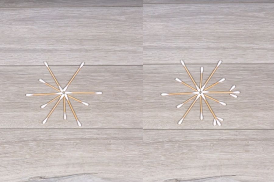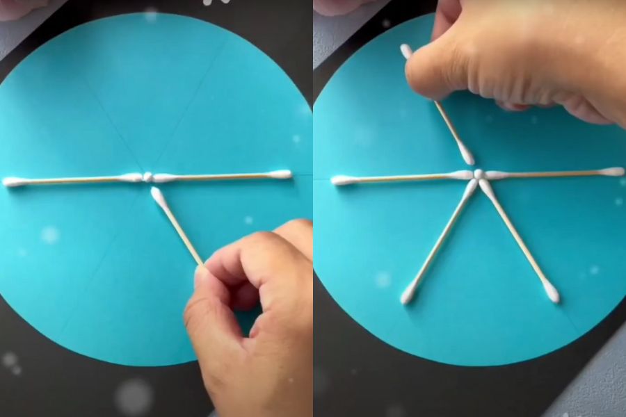 Bước 2: Dùng 6 bông còn lại để xếp thành hình ngôi sao 6 cánh. Lúc này, bạn cần hướng 6 đầu của bông tăm vào cùng một trọng tâm nhất định. Phần đuôi của 6 bông tăm này hướng về 6 hướng khác nhau, đồng đều về khoảng cách và cự ly.