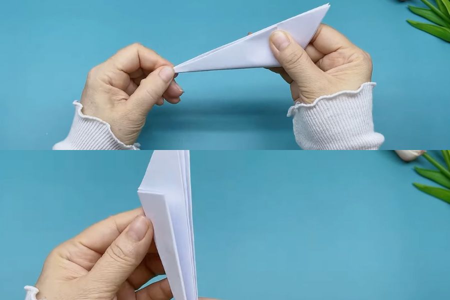 Bước 2: Từ 2 góc của đáy tam giác, bạn kéo chúng xếch ngược lên cho phần mũi mỗi góc chạm đỉnh của tam giác. Lúc này, 2 mép giấy đều được đặt vừa vặn, đúng trọng tâm và ngay ngắn.