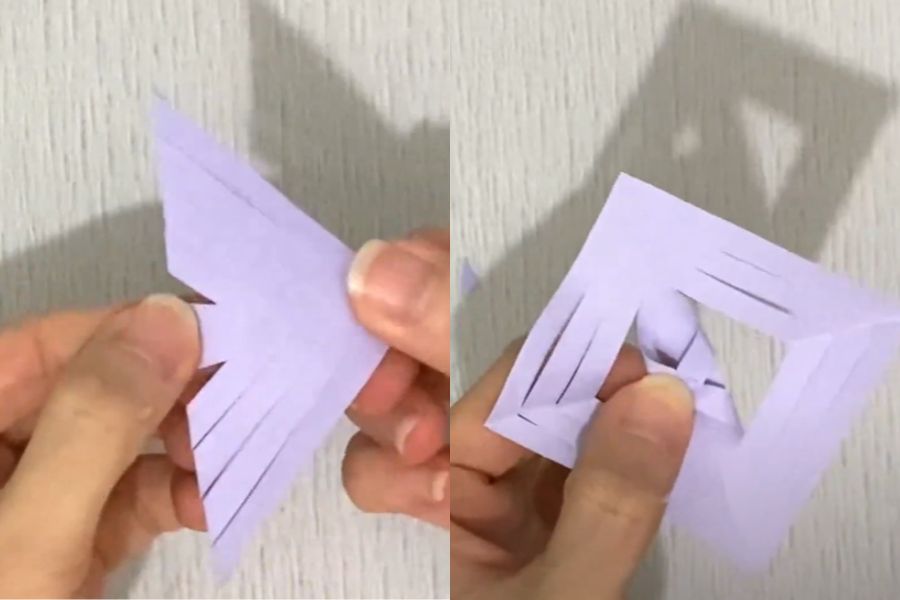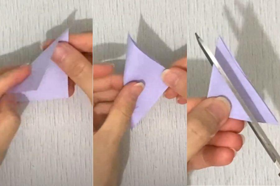 Bước 1: Xếp 6 tờ giấy hình vuông theo đường chéo để tạo thành hình tam giác. Sau đó, bạn tiếp tục cắt 3 nhát kéo song song dọc theo 2 cạnh của hình tam giác. Lưu ý không được cắt đứt mà cần chừa lại 1 ít để các hình vẫn còn dính vào nhau. Tiếp tục gấp đôi hình tam giác một lần nữa rồi cắt.