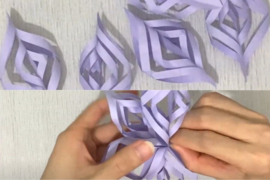 Bước 6: Dính 2 nửa bông tuyết này lại để tạo thành bông tuyết 6 cánh bằng cách dính các cánh hoa lại với nhau tại các vị trí chạm. Lúc này, bạn đã có thể hoàn thành những bông tuyết 3D bằng giấy để trang trí Giáng Sinh cho căn nhà của mình.
