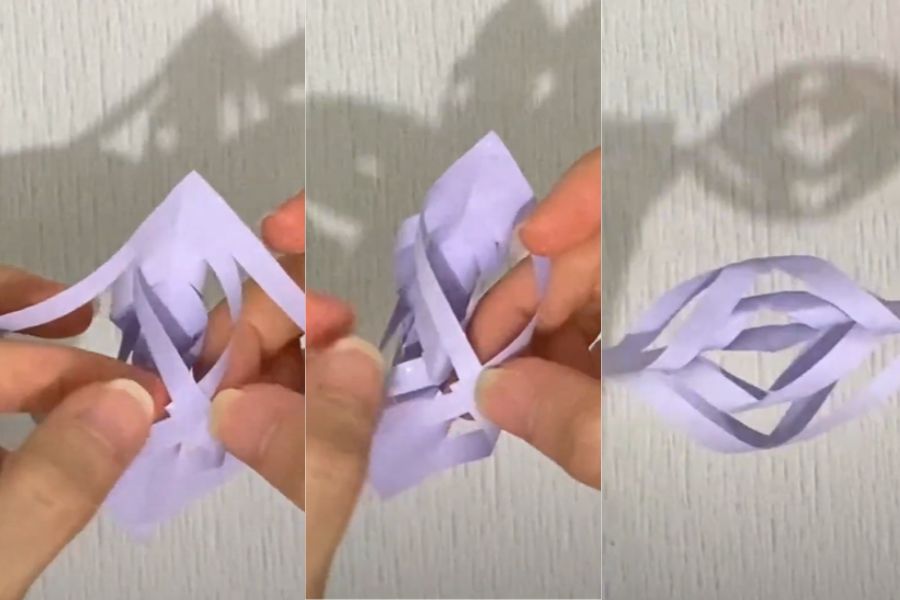 Bước 5: Thực hiện tiếp cho 5 tờ giấy hình vuông còn lại. Sau đó dùng kim kẹp dính 3 cuộn giấy đã cuốn trước đó lại thành 1 đầu. Với 3 cuộn giấy còn lại, bạn làm tương tự để có được 2 nửa bông tuyết, mỗi nửa có 3 cánh.