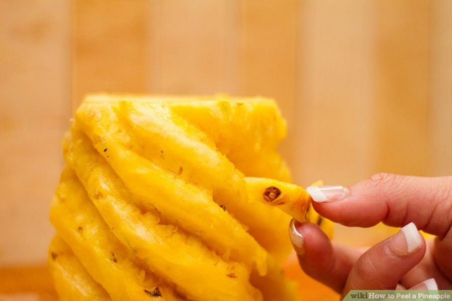 Bước 3: Để loại bỏ mắt dứa,bạn bắt đầu từ phần giữa của quả dứa. Sau đó, xác định mắt dứa nằm chéo nhau thẳng hàng rồi cắt bỏ để tạo thành đường chính.