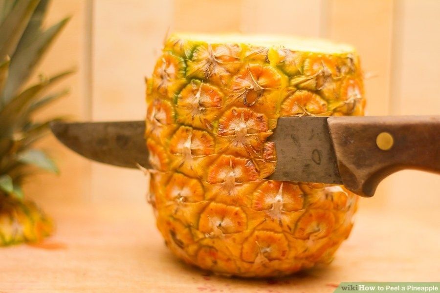 Bước 2: Sau đó, bạn đặt quả dứa thẳng đứng, hướng lên trên rồi dùng dao gọt xung quanh quả dứa để loại bỏ lớp vỏ.