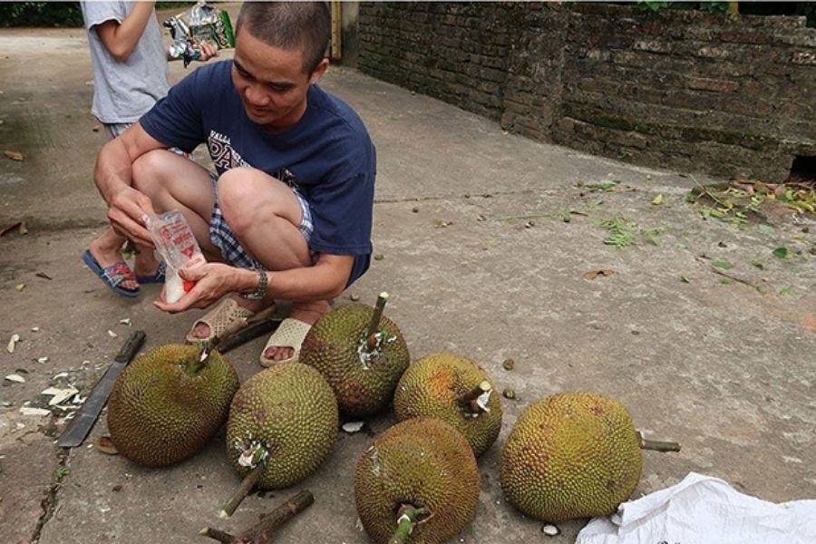 Cách làm mít chín bằng cách đóng cọc nghe có vẻ lạ nhưng lại rất hiệu quả và được dùng cho những trái mít chưa bị bổ đôi: