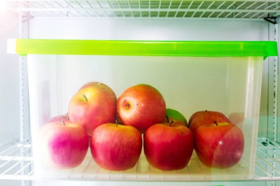 Để bảo quản táo trong tủ lạnh bạn cần cho chúng vào hộp không cần đậy kín. Sau đó phủ một lớp khăn giấy hoặc vải mỏng trên bề mặt, rồi đặt trong ngăn mát tủ lạnh.