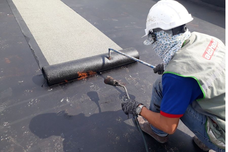 - Bước 4: Bạn lướt qua lại ngọn lửa để chắc chắn rằng các miếng dán đã dính đều vào bề mặt sân thượng. Các thao tác cần thực hiện nhanh chóng để lớp dính được hiệu quả nhất nhé!