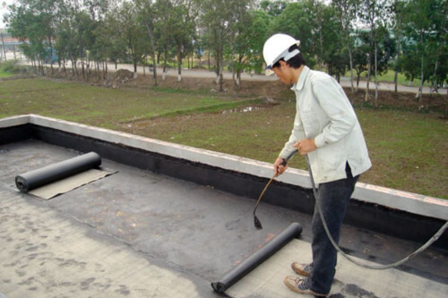 - Bước 2: Bạn nung chảy nhựa đường. Sau đó bạn có thể pha thêm vào nhựa đường dầu DO để giúp hỗn hợp này thẩm thấu nhanh hơn vào bề mặt bê tông. Tiếp đến bạn sử dụng con lăn phủ đều hỗn hợp này lên bề mặt sân thượng.