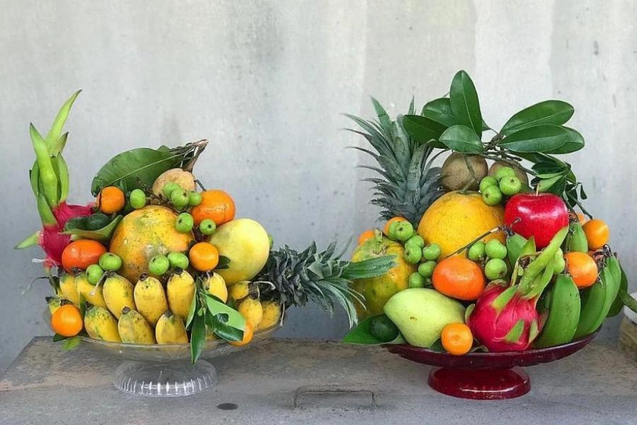 Bước 3: Đặt các quả có màu sắc khác nhau tại mỗi góc của mâm để tạo sự tương phản, hài hòa và thu hút.