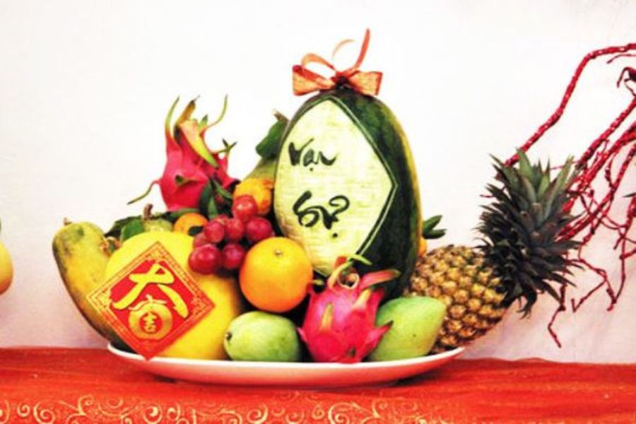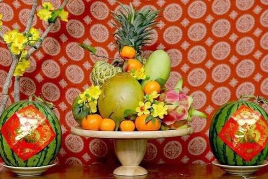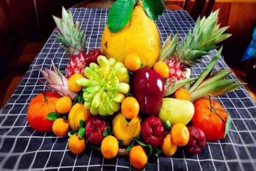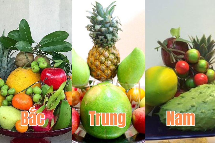 - Miền Trung: Do khí hậu khắc nghiệt, người miền Trung chọn trái cây sẵn có như dứa, thanh long, mãng cầu, sung, và dưa hấu. Mâm quả giản dị nhưng vẫn gửi gắm lời chúc gia đình sung túc, vẹn toàn.