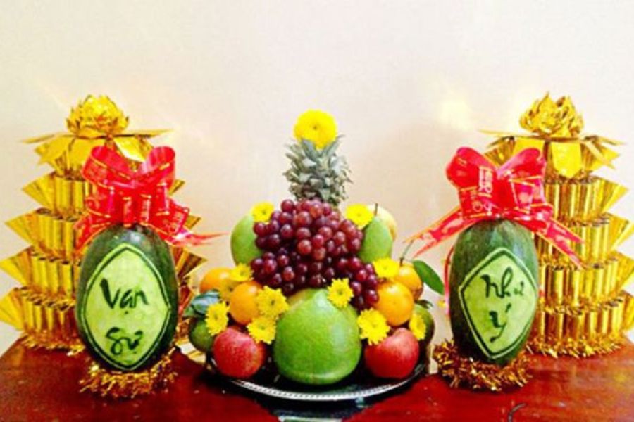Bước 2: Đặt các hình nghệ thuật này ở vị trí nổi bật trên mâm ngũ quả để tạo sự ấn tượng hoặc bày trí riêng trên bàn thờ.