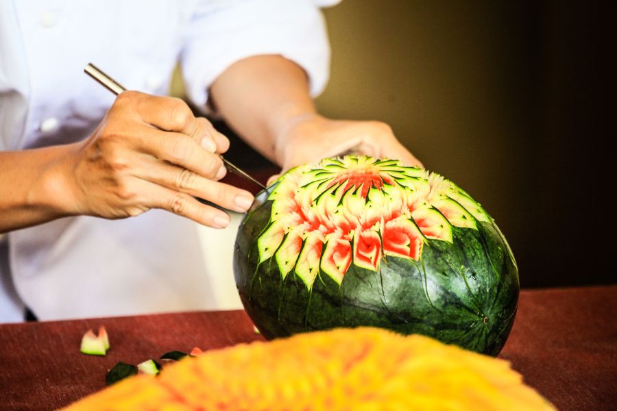 Bước 1: Sử dụng dao tỉa để cắt trái cây thành các hình hoa lá hoặc khắc các chữ Phúc – Lộc – Thọ