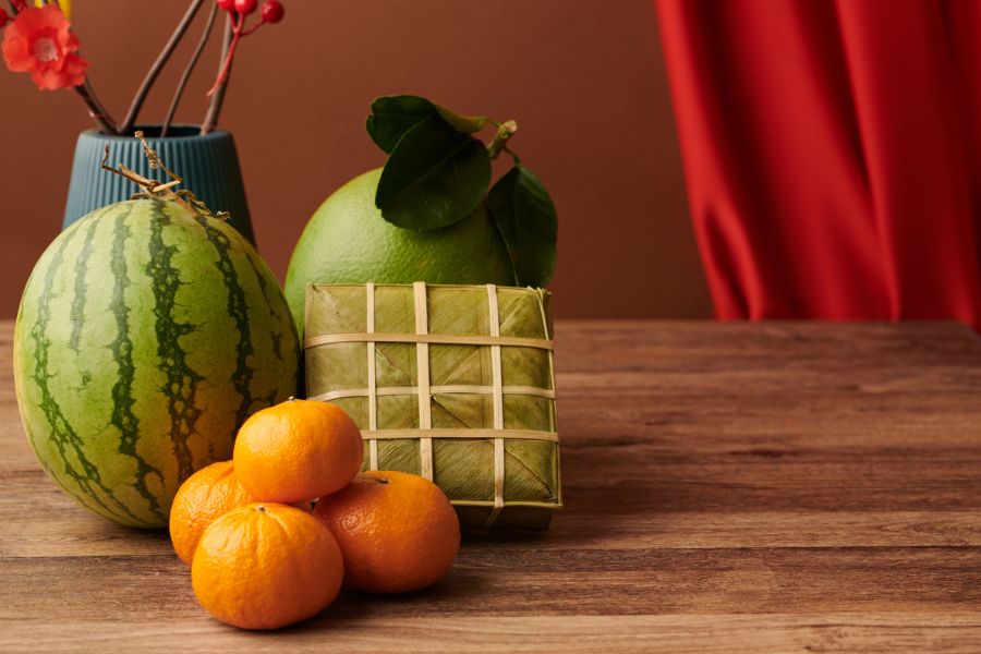 Bước 1: Đặt bánh chưng hoặc bánh tét ở vị trí bên cạnh hoặc chính giữa mâm ngũ quả, tạo sự liên kết giữa ẩm thực và các biểu tượng phong thủy ngày Tết.