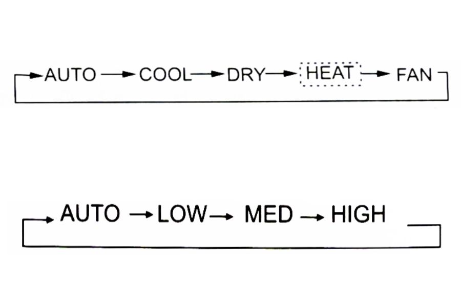 - Bước 2: Nhấn nút MODE rồi lựa chọn chế độ vận hành theo nhu cầu sử dụng (AUTO, COOL, DRY, HEAT, FAN). Để điều chỉnh nhiệt độ theo ý muốn, bạn nhấn vào cụm phím TEMP ∧ (tăng lên) hoặc TEMP ∨ (giảm đi).